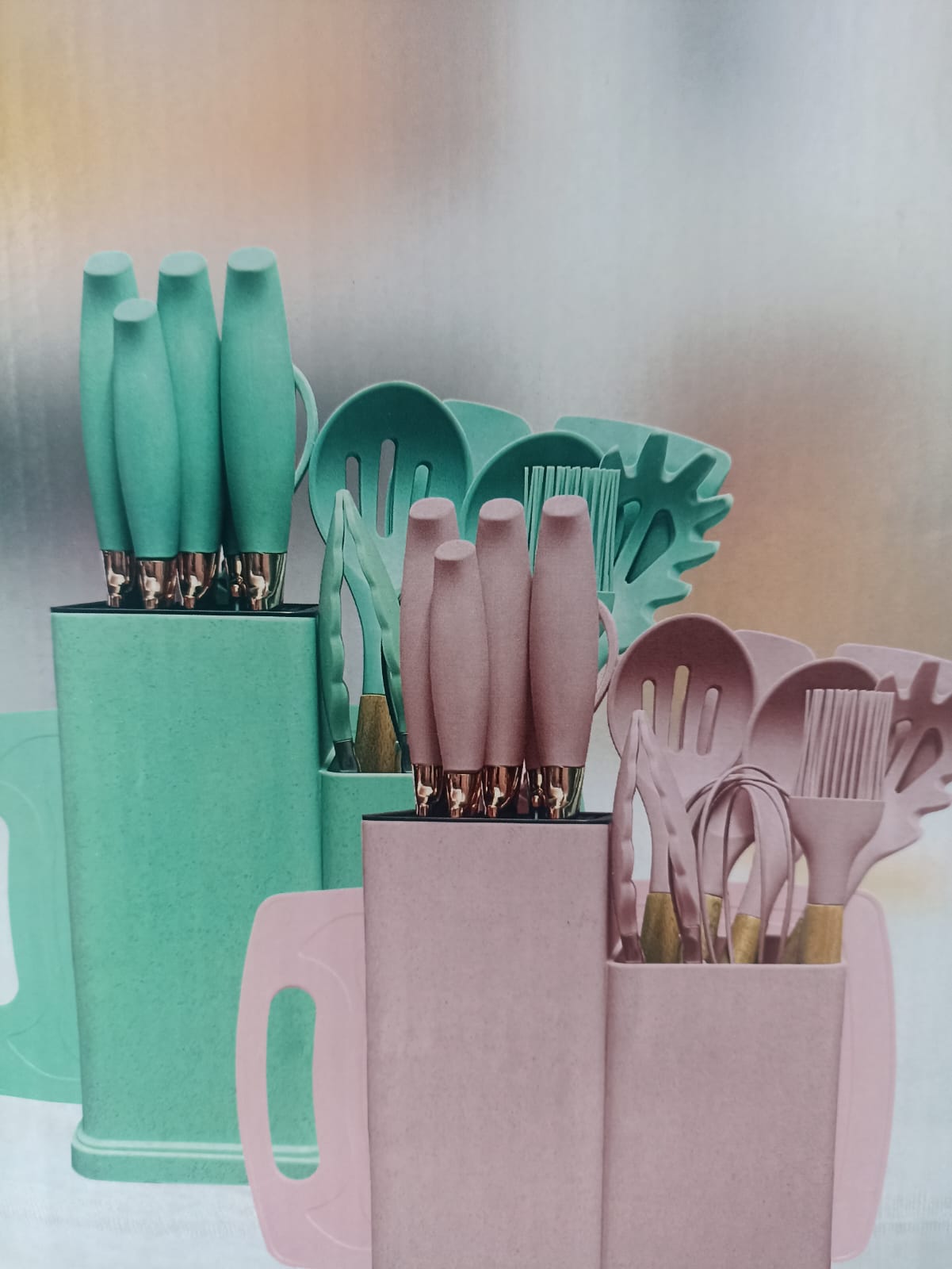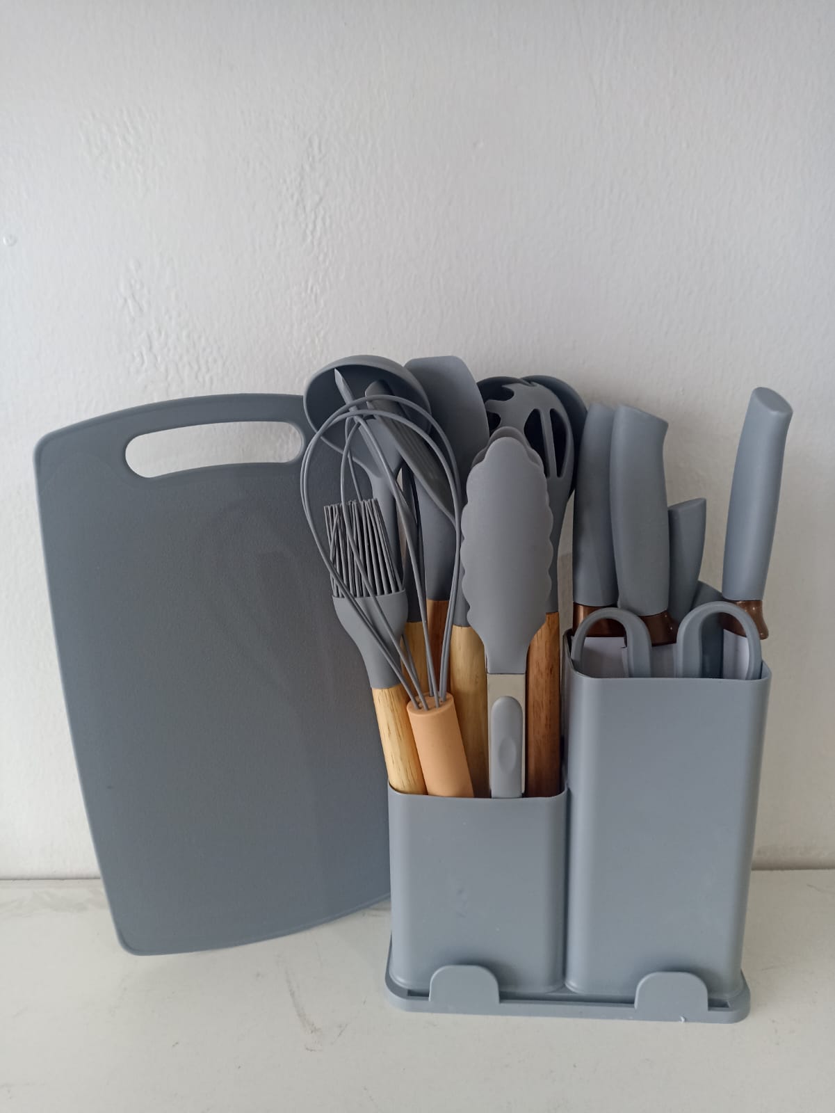 Este práctico kit de utensilios de cocina incluye todo lo necesario para preparar tus comidas favoritas con estilo y funcionalidad. Su diseño moderno en color gris y materiales resistentes lo hacen ideal para cualquier cocina.